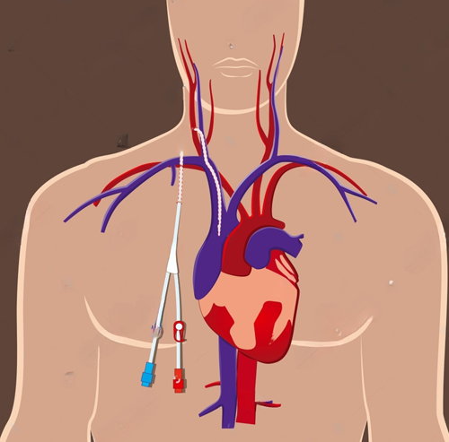 A dialysis catheter is a thin, flexible tube inserted into a large vein—usually in the neck (internal jugular vein), chest (subclavian vein), or groin (femoral vein). It allows blood to flow out of the body to the dialysis machine and return after being filtered.